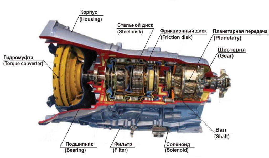 Схема автоматической коробки передач в разрезе: Корпус, Стальной диск, Фрикционный диск, Планетарная передача, Шестерня, Вал, Соленоид, Фильтр, Подшипник, Гидромуфта