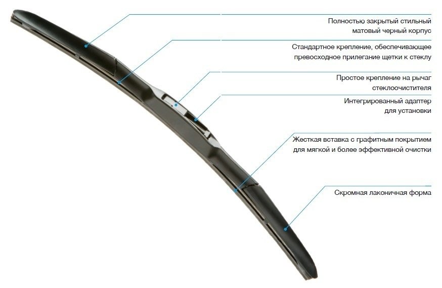 Следует отметить, что по сравнению с каркасными и бескаркасными, гибридная щетка стеклоочистителя характеризуется неоспоримыми преимуществами: