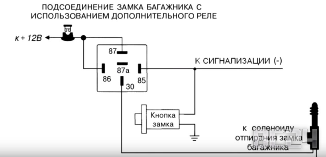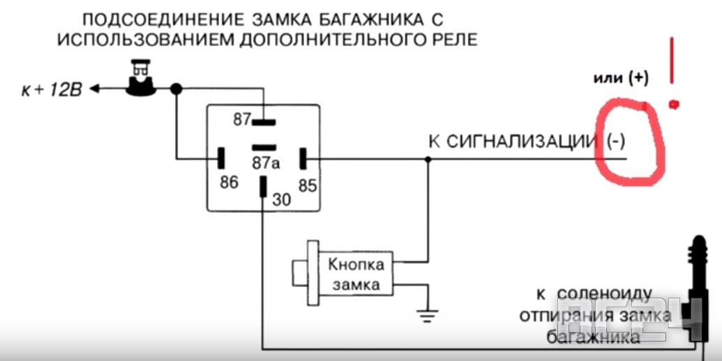 С помощью схемы мы подключили функцию открытия багажника к сигнализации.