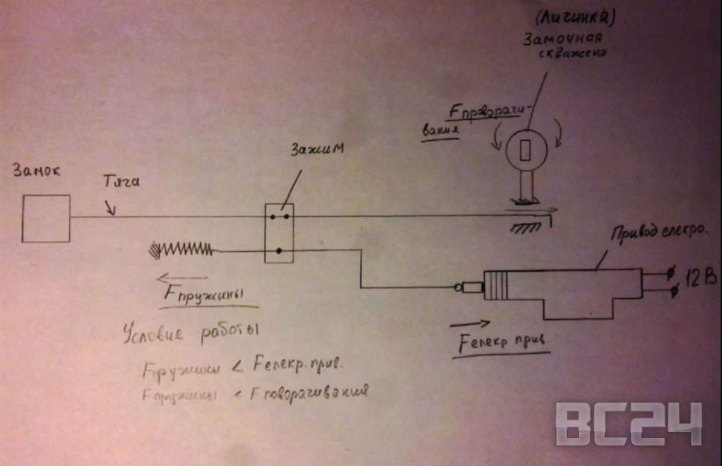 Установили и пружину, которая тянет назад этот механический электропривод. Так как в самом замке не предусмотрено, чтобы он возвращался в исходное положение. Мы сохранили и механику и установили электрику, одно другому не мешает.