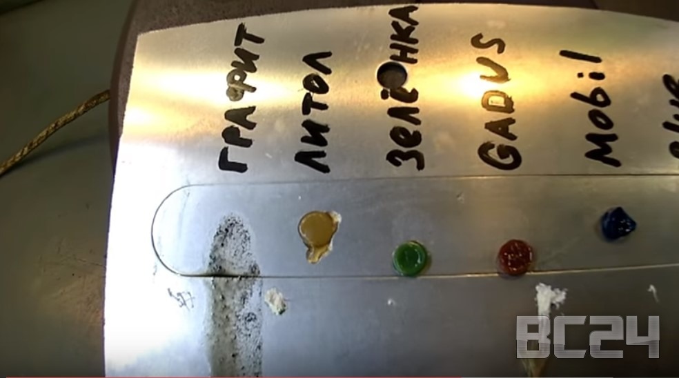 Мы нанесли смазки в одинаковом количестве на металлический лист, который под наклоном лежит на плитке.